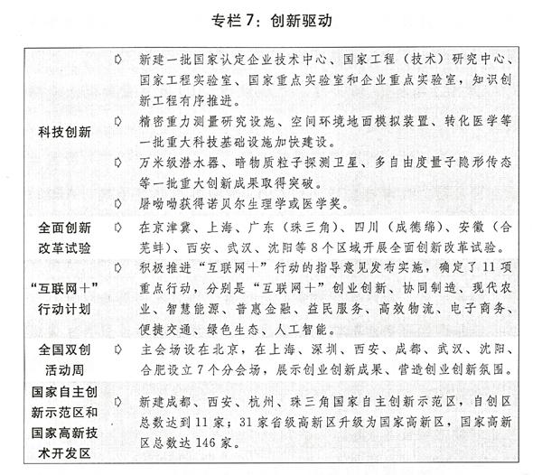 (三)坚持创新驱动发展,新产业新业态加快形成。出台深化体制机制改革加快实施创新驱动发展战略的若干意见,推进全面创新改革试验,大力推动创新和产业升级。