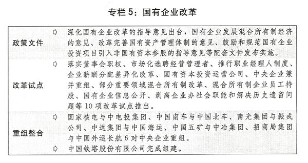 五是国有企业和重点行业改革稳步展开。10项国有企业改革试点启动实施。国资委履行出资人职责的中央企业从112家减少到106家。新一轮电力体制改革启动。石油天然气勘查开发体制改革开始试点。国有林场和国有林区、水利、供销社、农垦改革有序推进。