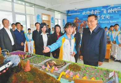 4月24日,李克强总理来到芦山县第二初级中学考察学校重建情况,在学校“创客空间”兴致勃勃参观孩子们的创意作品。 四川日报记者毛漫丁摄