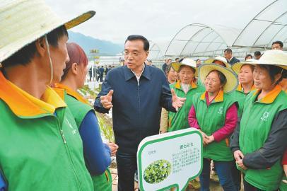 4月24日,李克强总理来到芦山县龙门乡康源生态农业园,考察土地流转和园区生产收入等情况,与正在地里劳作的群众亲切交流。 四川日报记者毛漫丁摄