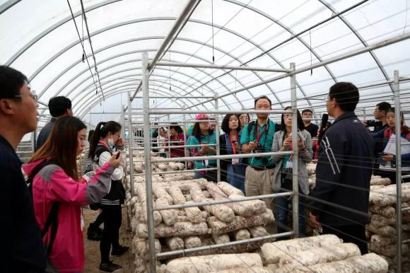 网媒记者在南栗园铺村食用菌生产大棚采访。