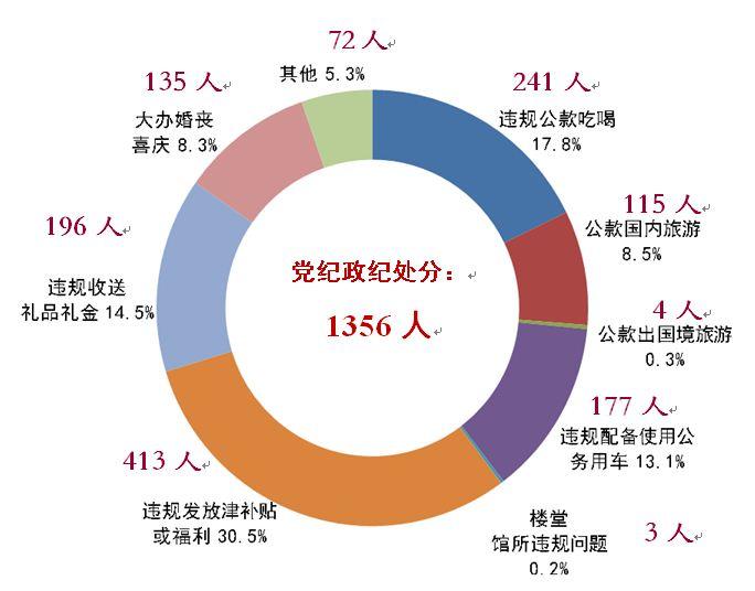 从查处问题看,“违规发放津补贴或福利”问题最为突出,共处分413人,占处分总人数的30.5%;居第二位的是“违规公款吃喝”问题,处分241人,占17.8%;居第三位的是“违规收送礼品礼金问题”,处分196人,占14.5%。