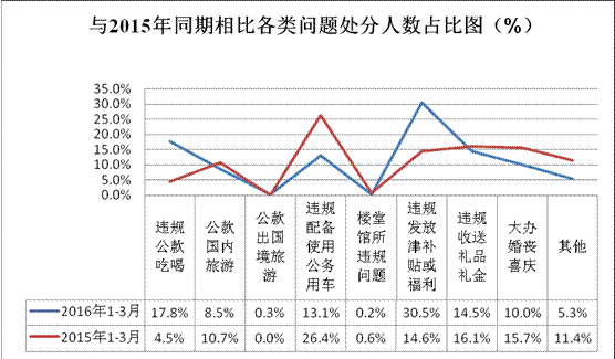 与2015年同期相比,因“违规配备使用公务用车”受处分人数占比下降13.3个百分点。同时,因“违规发放津补贴或福利”“违规公款吃喝”问题受处分人数占比明显上升。
