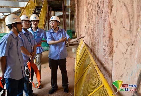 周予启(右一)为项目技术人员讲解基坑加固技术。本人供图