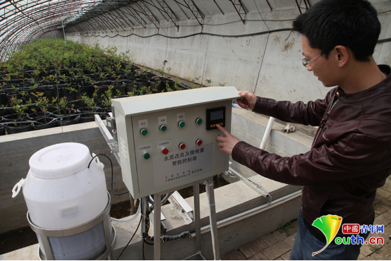杨代显在蓝莓基地操作着大棚智能控制器。中国青年网见习记者 岳巍摄