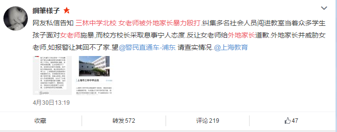 据网友所发微博称,三林中学北校一外地家长纠集多名社会人员闯进教室当着众多学生孩子面对一女老师进行殴打,而该校校长在事发后却反让女老师给外地家长道歉。外地家长并威胁女老师,如报警就让其回不了家。截止记者发稿,该微博已累计被转发572次,评论218次。