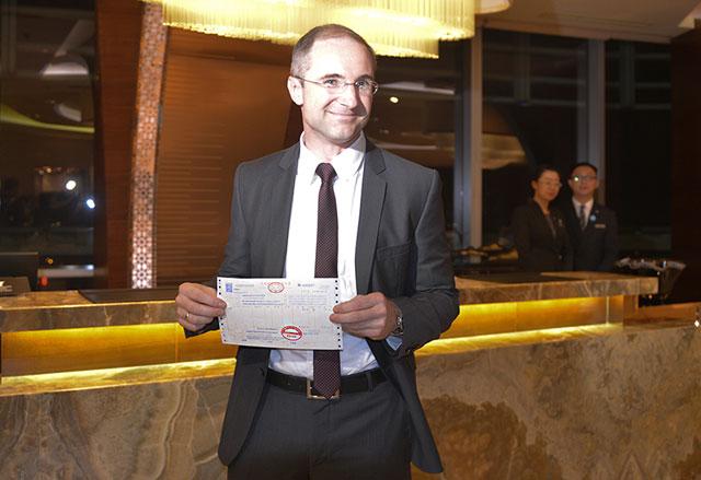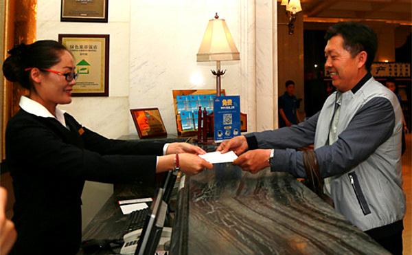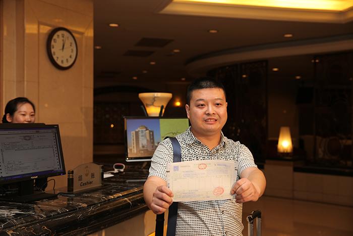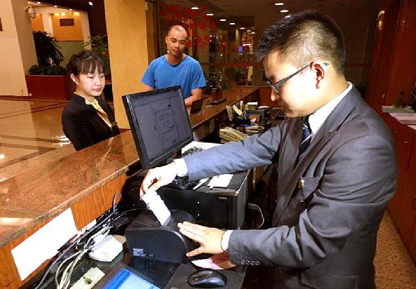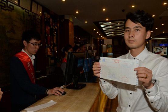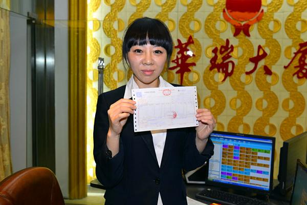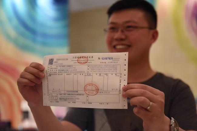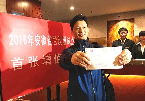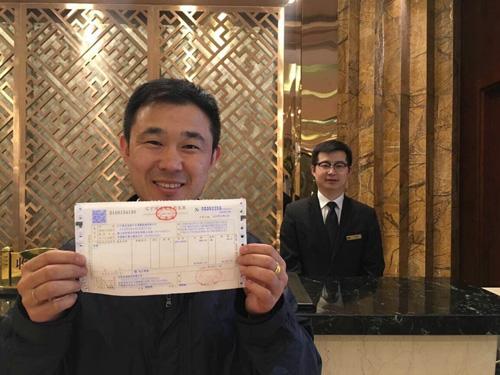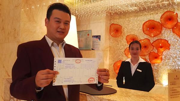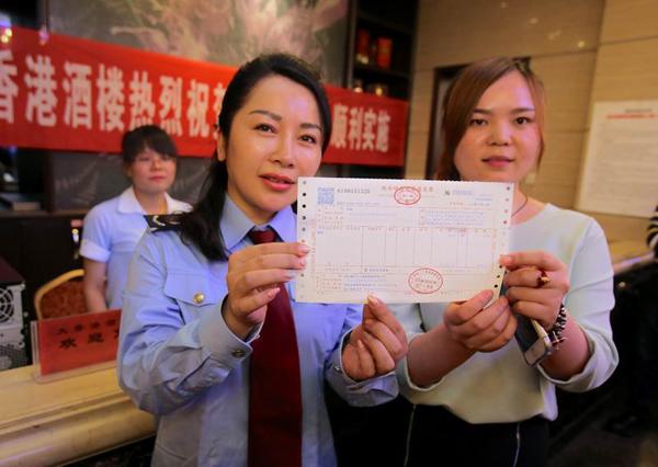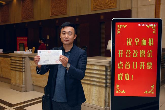 【福建】5月1日,住客谢平在展示由福州大饭店开出的营改增试点全面推开后福建省首张增值税发票。