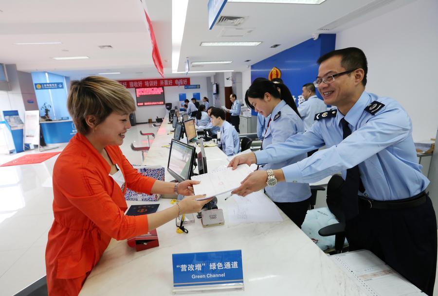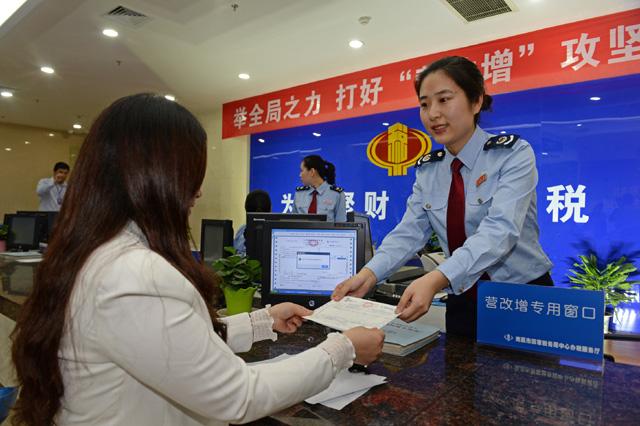 【广西】5月1日,在广西柳州市融安县国税局办税大厅,工作人员为纳税人办理增值税普通发票领用业务。当日,营业税改征增值税改革在全国推开。
