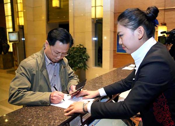 【全国首张】4月30日24时许,陈生(左)在北京民族饭店填写增值税发票客户信息表。5月1日,营业税改征增值税改革在全国推开。当天零点一过,正在北京民族饭店结账的温州商人陈生接过了饭店开出的第一张增值税专用发票,令他惊喜的是这张发票也是营改增试点全面推开后全国首张增值税发票。