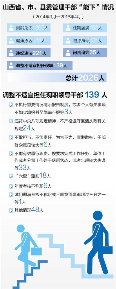 一年7个月的时间里,山西全省共调“下”领导干部2026人。其中,到龄免职1205人、任期届满离任152人、健康原因调整123人、违纪违法免职221人、自愿辞职151人、问责免职35人、调整不适宜担任现职139人。在139名被调整的不适宜担任现职的干部中,94人或因不敢担当、不负责任,为官不为、庸懒散拖;或因不能有效履行职责,出现较大失误,能力不足,年度考核不称职等,被免职或改任非领导职务。