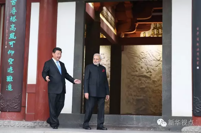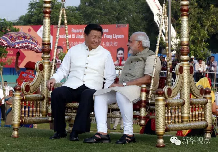 这里回放两个场景:一个是2014年9月,习近平主席访印期间在古吉拉特邦同印度总理莫迪同坐摇椅;另一个是2015年5月,习近平主席在西安同访华的莫迪一同参观大慈恩寺。