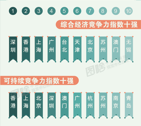 与去年相比,综合经济竞争力十强城市中,广州超越台北跻身第4位,北京超越苏州跻身第7位。可持续竞争力指数十强城市中,青岛取代厦门进入可持续竞争力十强城市之列,深圳超越澳门跻身可持续竞争力十强城市第4位。