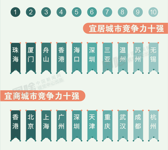 而宜商城市竞争力十强基本上为全国性和区域性中心城市。香港、北京、上海仍牢牢占据中国宜商城市竞争力三甲位置,重庆从去年的第9位跃升至今年的第7位,而杭州则取代南京跻身于宜商竞争力十强城市。