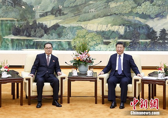 6月1日,中共中央总书记、国家主席习近平在北京会见了朝鲜劳动党中央政治局委员、中央副委员长、国际部部长李洙墉率领的朝鲜劳动党代表团。 中新社记者 杜洋 摄