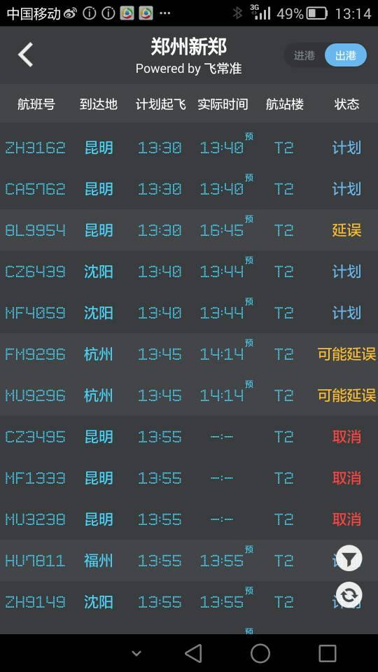 晚上航班中,广州方向取消3班,沈阳方向3班延误。郑州飞福州2个航班取消。
