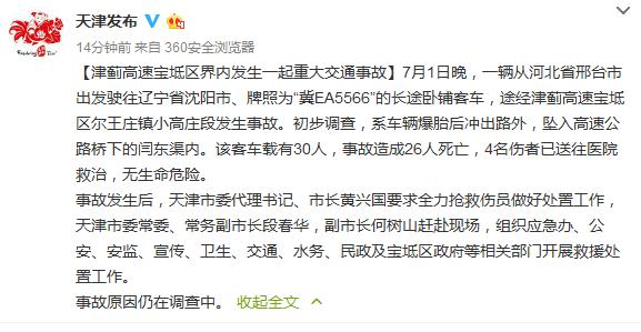 中新网7月2日电 据天津市人民政府新闻办公室官方微博消息,7月1日晚,一辆从河北省邢台市出发驶往辽宁省沈阳市、牌照为“冀EA5566”的长途卧铺客车,途经津蓟高速宝坻区尔王庄镇小高庄段发生事故。