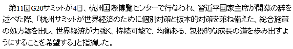 9月4日,习近平主席在G20杭州峰会上致辞时表示,“希望杭州峰会能够在以往的基础上,为世界经济开出一剂标本兼治、综合施策的药方,让世界经济走上强劲、可持续、平衡、包容增长之路。”