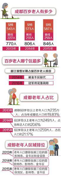 据成都市老龄办相关数据显示,截至2015年12月31日,成都市百岁老人共计846人,比2014年增加40人,110岁以上的共有7人。这846位百岁老人中,依旧呈现“阴盛阳衰”之势,男性259人,女性587人。