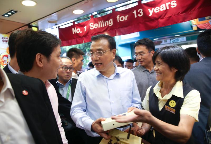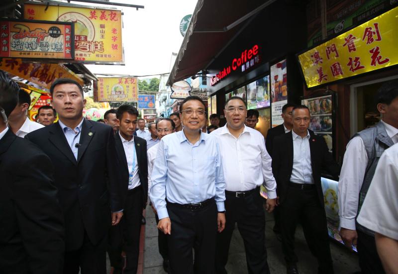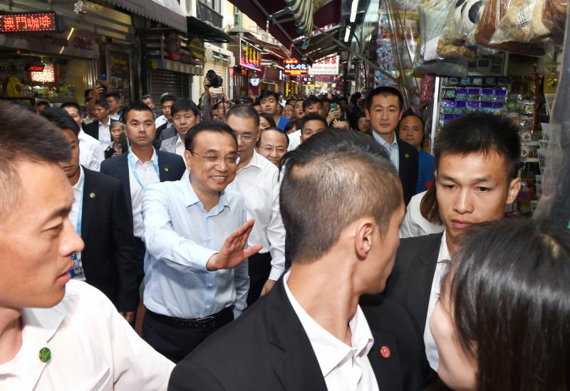 李克强11日下午来到澳门氹仔市区最热闹的官也街。这条长约百米的老街汇聚中餐厅、葡国餐厅和售卖当地特产的手信店,澳门风情浓郁。看到总理到来,当地市民和游客欢呼着争相与他握手自拍。李克强随意走进几家店铺询问店主经营状况,并买了一盒蛋挞、一盒金桃酥和一张明信片。