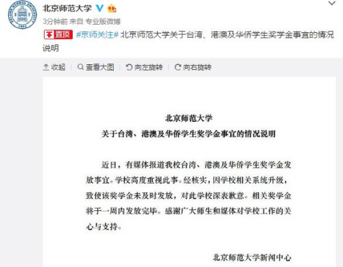 北师大今日发布关于台湾、港澳及华侨学生奖学金事宜的情况说明指出,经核实,因学校相关系统升级,致使该校奖学金未及时发放,对此学校深表歉意。