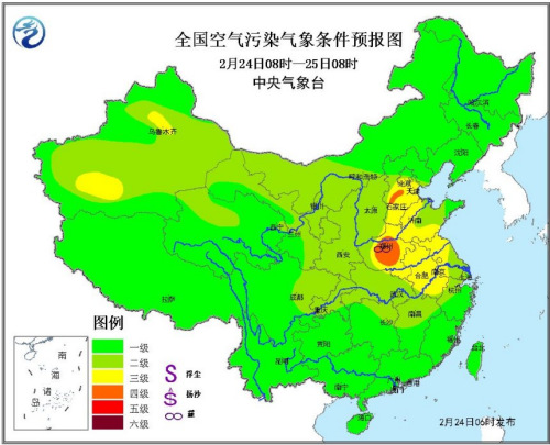 24日08时至25日08时,全国大部地区大气扩散条件较好,仅华北中南部、黄淮中西部、江淮东部等地的部分地区空气污染气象条件为3~4级。