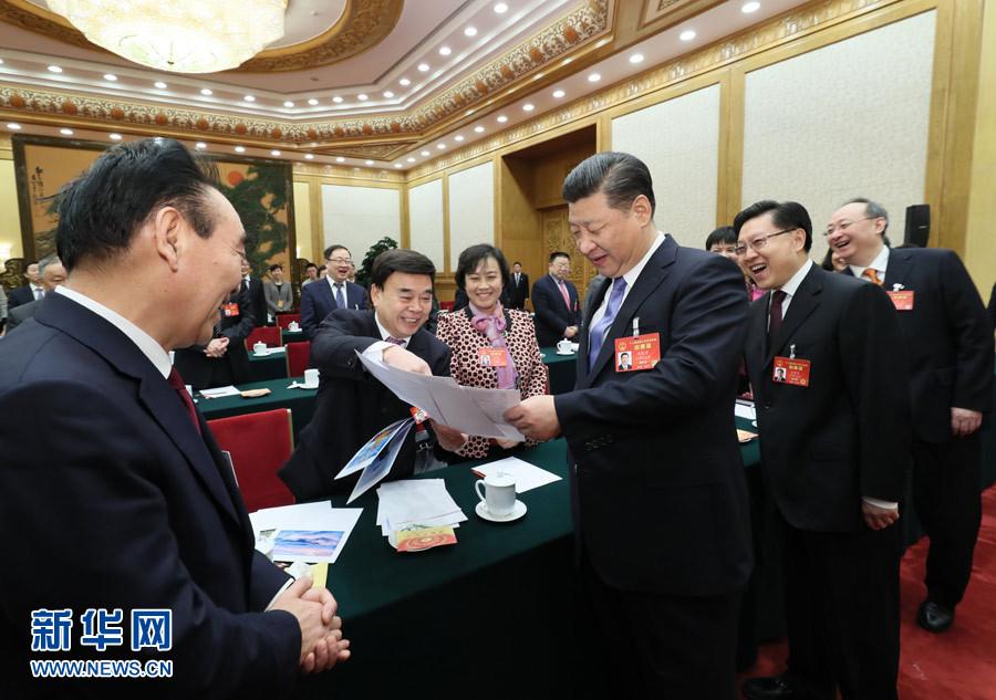 2017年3月4日下午,中共中央总书记、国家主席、中央军委主席习近平看望参加全国政协十二届五次会议的民进、农工党、九三学社委员,并参加联组会,听取意见和建议。中共中央政治局常委、全国政协主席俞正声参加看望和讨论。新华社记者 饶爱民 摄