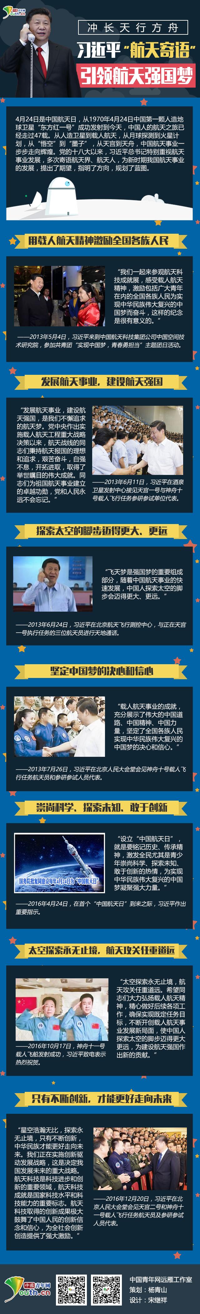 参与互动 中国青年网北京4月24日电(记者 杨青山)4月24日是中国航天日,从1970年4月24日中国第一颗人造地球卫星“东方红一号”成功发射到今天,中国人的航天之旅已经走过47载。从人造卫星到载人航天,从月球探测到火星计划,从“悟空”到“墨子”,从天宫到天舟,中国航天事业一步步走向辉煌。党的十八大以来,习近平总书记特别重视航天事业发展,多次寄语航天界、航天人,为新时期我国航天事业的发展,提出了期望,指明了方向,规划了蓝图。