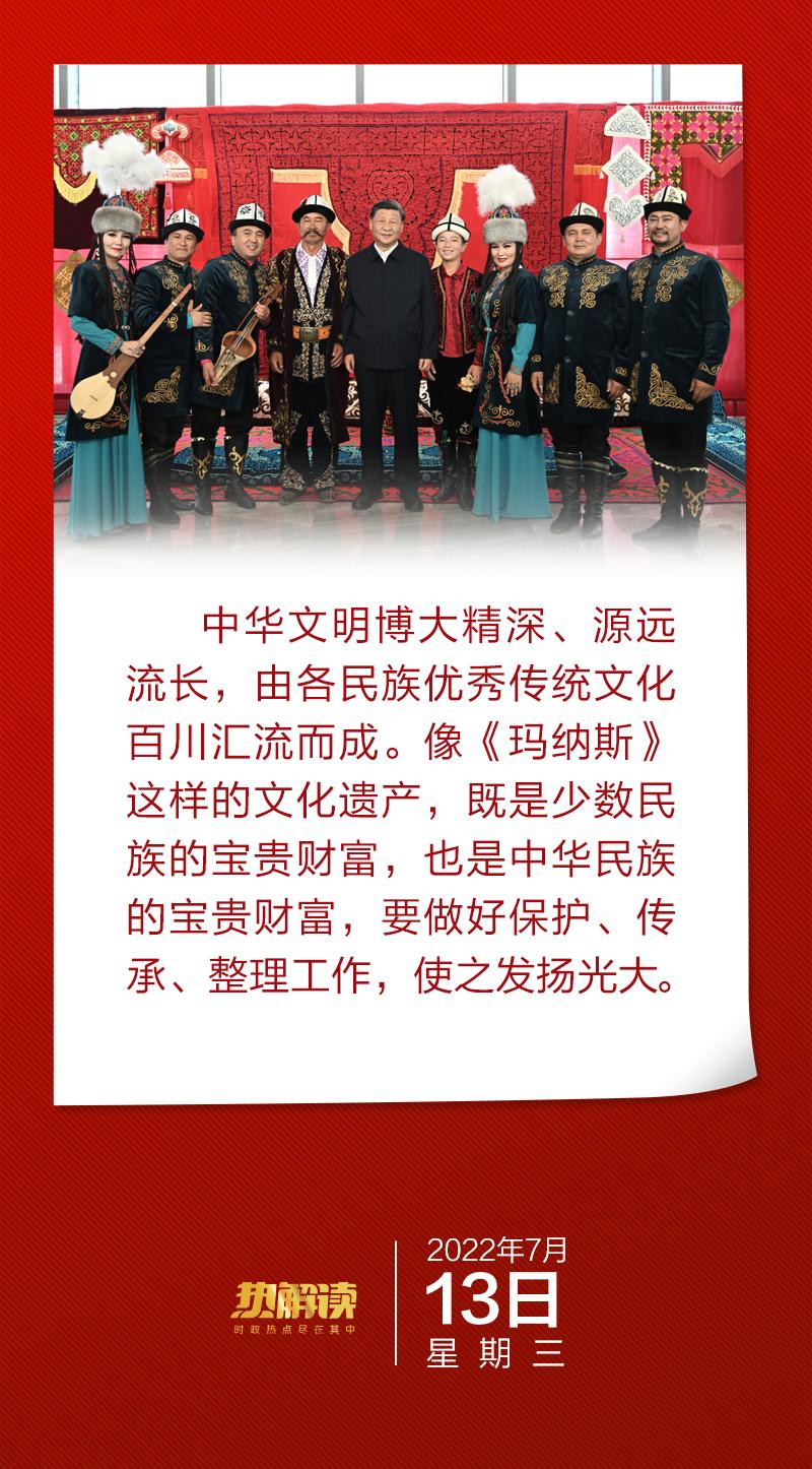 在同《玛纳斯》非物质文化遗产传承人交谈时,总书记要求对《玛纳斯》这类少数民族的宝贵财富、中华民族的宝贵财富,做好保护、传承、整理工作,使之发扬光大。