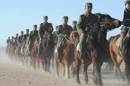 同时,他们也是一段历史的延长线。在人民军队的发展历史上,骑兵部队南征北战,曾经建立了卓越的功勋。从一定程度上说,人民的江山也是马背上驮来的。熟悉我军征战史的人,在记忆深处的某个位置,总会保留着英雄骑兵的一些战斗片断。看到今天在内蒙古边防线上生龙活虎地奋斗着的骑兵兄弟,我们就会想起,在昔日战火纷飞的沙场上骑兵英雄横刀立马,驰骋疆场的生动形象,就会听到密如战鼓的声声马蹄,更为重要的是,我们会再次感受到那雷厉风行,一往无前的骑兵战斗精神。