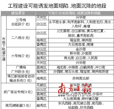 《方案》提出,根据广州市地质环境条件,结合本年度大型工程开工建设情况,预测可能因工程施工引发地面塌陷、沉降的地段有46处,需重点加以防范。其中包括地铁三号线北延段、六号线、二八线、广佛线广州段,珠江新城旅客自动输送系统,武广客运专线地下隧道施工段,下穿流花湖隧道工程。而市地下轨道交通项目就有32处地质灾害隐患。