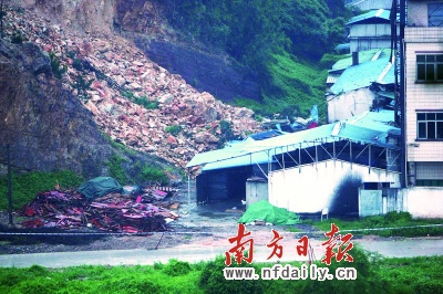 昨日上午,暴雨如注,东莞寮步镇泉塘村发生山体坍塌地质灾害,将附近厂房的一个铁皮房压坍,正在附近劳作的两名工人当场被掩埋(如图,苏仕日摄)。事发后,当地消防部门紧急出动,经过一个多小时的抢救将两名被埋者挖出,但送医后经抢救无效死亡。消防部门发出警告,由于降雨一直不停,该地段山体仍有滑坡可能。