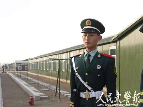板房式宿舍座北朝南,一间30平方米左右,整整齐齐放着8套高低床,进门一侧墙固定了两根不锈钢管,是专门用来搭毛巾的。窗户下方有一个制式报架,上面有《解放军报》、《人民武警报》、《阅兵快报》和《解放军画报》、《解放军文艺》等杂志。靠东西两侧墙放置的是喷塑铁制内务柜,一个柜子四个门,一人一个门,柜内有挂衣杆,下方是一个内置小抽屉,用来放置个人小物品。屋子中间放置一张长2.4米、宽1.2米的六腿大方桌,中间摆着一排1500毫升的水杯,桌子下面整整齐齐摆着小方凳。这张桌子作用很大,召开班务会大家围成一圈,平时可以坐着看书看报喝水,还可以在上面熨烫衣服。地面铺的是城区用来铺设便道用的紫色防滑方砖。正值夏天,因为密封性能较差,屋里潮气较重,队员的被子总是潮乎乎的,好在每个宿舍都安装了空调,大大减少了潮气。再细心观察,不难发现每个床位外侧床沿都贴着一张精致的小卡片,卡片上印着床位主人的照片、职别和姓名,更有意思的是每张小卡片上都印着一句不同的格言和励志警句,就连毛巾杆和放置水杯的位置、内务柜上都贴有小卡片和编号,让人感到宿舍里秩序正规、整齐如一。