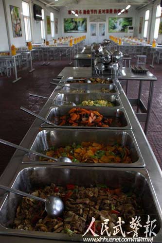 在阅兵村里,方队的食堂也属于"一流"的。饭堂里装有大功率柜式空调不说,每个饭堂还有4台超大液晶电视,在气温高达40度的热天,队员们可以舒舒心心吃好每一顿饭。除此之外,饭堂里还挂着七十多幅让人满目清新、胃口大增的画,有的是新鲜水嫩的蔬菜水果,有的是让人看着就爽人的冰镇饮料,有的美丽的山川河流的风景画。在阅兵村,受阅队员每天训练消耗的热量特别大,伙食的质量显得尤为重要,他们每人每天的伙食标准都在40元以上,炊事员都是精心挑选的敬业精神强、职业素质高、炊事技术精湛的二级以上等级厨师。