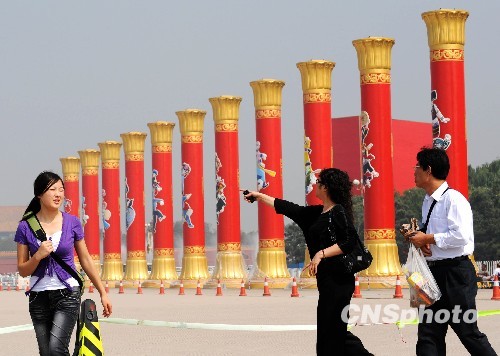作为新中国成立六十周年国庆庆典背景之一,天安门广场计划安置五十六根民族团结柱。民族团结柱以天安门城楼为中心,分东、西两面,呈南北延伸,每边各二十八根。