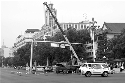 昨天15时许,为保证彩排车辆顺利通行,府右街路口暂时移开横臂式信号灯。本报记者吴平摄