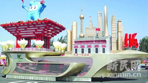 这辆名为“腾飞上海”的彩车长15米、宽6米,犹如一艘破浪前行的金色航船,船首是中共一大会址的建筑造型,背后是浦江两岸的高楼大厦,后方为上海世博会中国馆,上面有海宝挥舞国旗和鲜花,整个造型突出“上海背景,世博主题”,象征着上海乘风破浪,朝着建设国际金融中心和国际航运中心的目标快速前进。