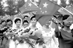 队伍一侧,婚纱拖地,白色显示圣洁,红色显示喜庆。这是由30对新人组成的新婚队。他们的婚礼,都集中在国庆前两个月内。