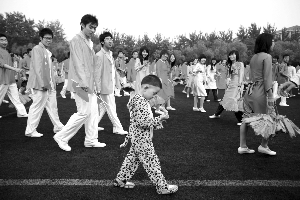 昨日下午,当音乐声响起,2343人的方阵整齐划一。但很快方阵里出现了“冒泡的队员”:3岁半的男孩派派,这是方阵里30个三口之家中的一员。