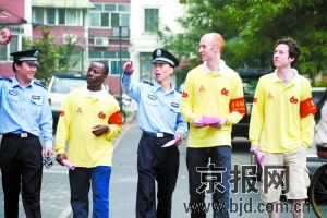 今天上午,三名身穿“首都治安志愿者”服装的外国志愿者在海淀区东王庄社区内执勤,并向社区居民发放治安宣传单。海淀分局针对附近外国居住者多沟通难的问题,特意招集了二十余名外国志愿者在五道口周边巡逻,确保国庆安全。