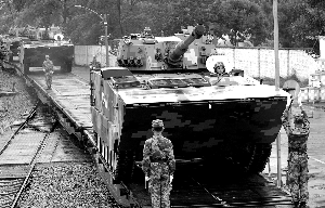 战车在战士的指挥下开上平板火车,准备启程返回部队。通讯员 李实 摄