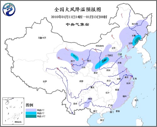 中新网1月11日电 中央气象台11日10时继续发布大风降温消息,预计11日下午至12日夜间,内蒙古大部、西北地区中部和东北部、东北地区南部、华北西部和北部、黄淮东部、江淮东部、江南东北部等地将先后出现4~5级、阵风6级偏北风;西北地区中部和东北部、华北西部和南部、东北地区中南部、黄淮东部、江淮东部、江南东部、华南东部等地气温将下降6~8℃,其中,甘肃西部、山西中部、辽宁东部局部地区降温可达10~12℃。