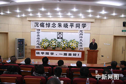 在中国政法大学学院路校区学术报告厅内,朱晓平的照片悬挂中央,上方书写着“沉痛悼念朱晓平同学”,下方写着“晓平同学,一路走好!”两侧是同学为他写的挽联:怒向海天发浩问,泪祭英雄慰忠魂。在追思会上,同窗好友追忆了他们记忆中“不说大话、不干虚事”的朱晓平同学。
