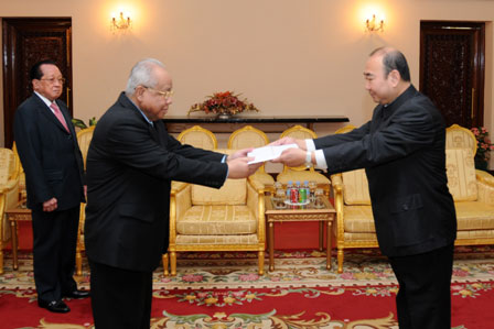 中新网3月17日电 据中国外交部网站消息,3月15日,中国新任驻柬埔寨大使潘广学向柬代理国家元首、参议院主席谢辛亲王递交国书。