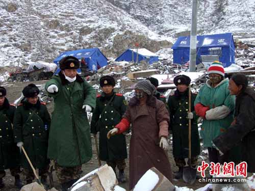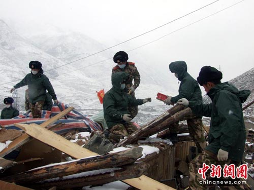 中新网玉树5月7日电 (石强)5月初,为了防止地震后山体滑坡、造成再次伤害,武警青海总队派格尔木第四支队对玉树禅古村二社进行整体搬迁。
