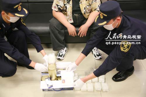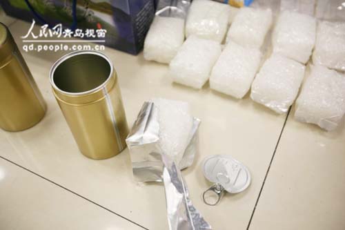 据海关旅检现场关员介绍,这名外籍旅客本打算乘坐5月12日东方航空公司的MU535航班从青岛飞往日本福冈,在经过海关出境旅检现场通关时,海关关员对其随身携带的编织袋过机检查,发现其中部分圆筒状物品图像可疑。进一步开包查验后,发现编织袋内装3盒共计10个铁质密封包装小桶。海关检查人员开拆了小桶,看到每桶内装锡纸涂层的塑料包装袋,剥去锡纸后显露出真空包装的白色晶体物质,而不是旅客自称的"茶叶"。现场关员迅速对这些白色晶体进行了毒品快速检验和缉毒犬识别,都呈现毒品反应,后经送鉴,最终确定为冰毒,共计2475克。