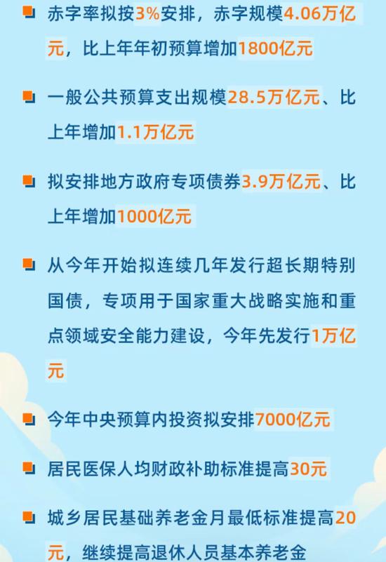赤字率拟按3%安排,赤字规模4.06万亿元,比上年年初预算增加1800亿元。预计今年财政收入继续恢复增长,加上调入资金等,一般公共预算支出规模28.5万亿元、比上年增加1.1万亿元。拟安排地方政府专项债券3.9万亿元、比上年增加1000亿元。