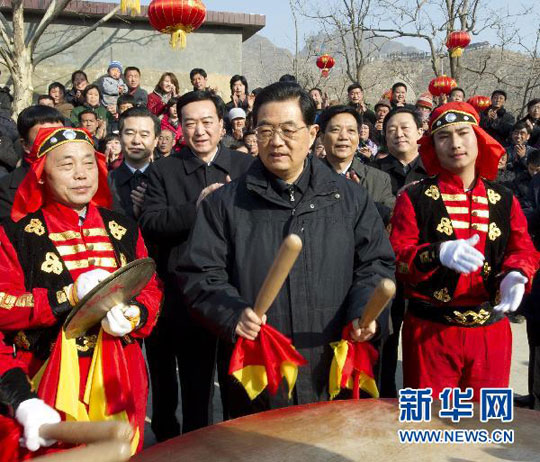 在这个春节,胡锦涛和温家宝用他们充满亲情和温情的人性化言行,让很多中国人感到温暖。胡锦涛在保定的武警营房,与普通战士一起包饺子,给战士敬酒拜年;在农家,按照当地习俗,给刚蒸好的馒头点上红,亲手切下几块年糕给村民品尝,在农家院门上贴上“福”字,祝愿老百姓日子更红火、生活年年高,更在村里的秧歌会上拿起鼓槌,亲手擂响大鼓。温家宝在安徽金寨农家,亲手下厨做肉圆汤,在山东曲阜农家与农民一起包饺子,共庆春节。这些平易近人的画面镜头,赢得众多网民的好评,被赞“给力”。