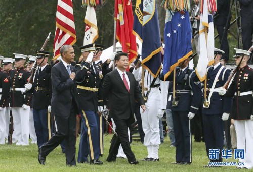 9月25日,中国国家主席习近平在华盛顿白宫南草坪出席美国总统奥巴马举行的欢迎仪式。新华社记者 兰红光 摄 图片来源:新华网