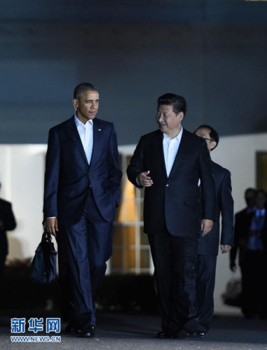 9月24日,国家主席习近平在华盛顿出席美国总统奥巴马举行的私人晚宴。这是习近平和奥巴马从白宫步行前往举行晚宴的国宾馆。新华社记者 李学仁 摄 图片来源:新华网