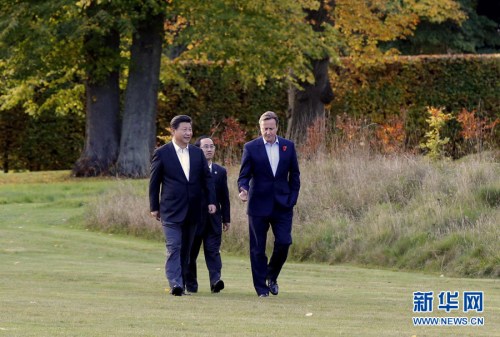 10月22日,国家主席习近平在契克斯首相乡间别墅同英国首相卡梅伦再次会晤。这是习近平与卡梅伦漫步草坪,边走边谈。 新华社记者 鞠鹏 摄 图片来源:新华网